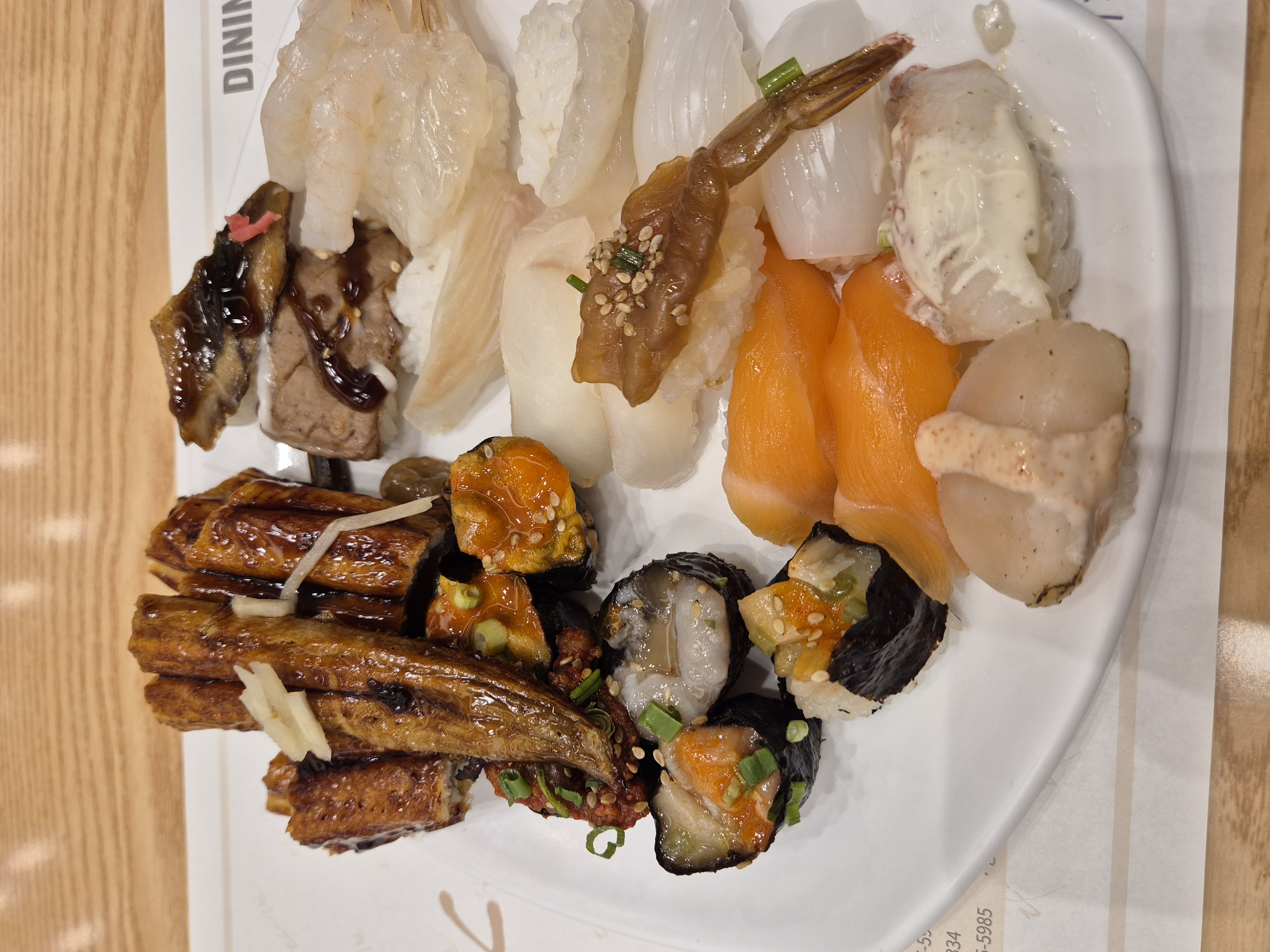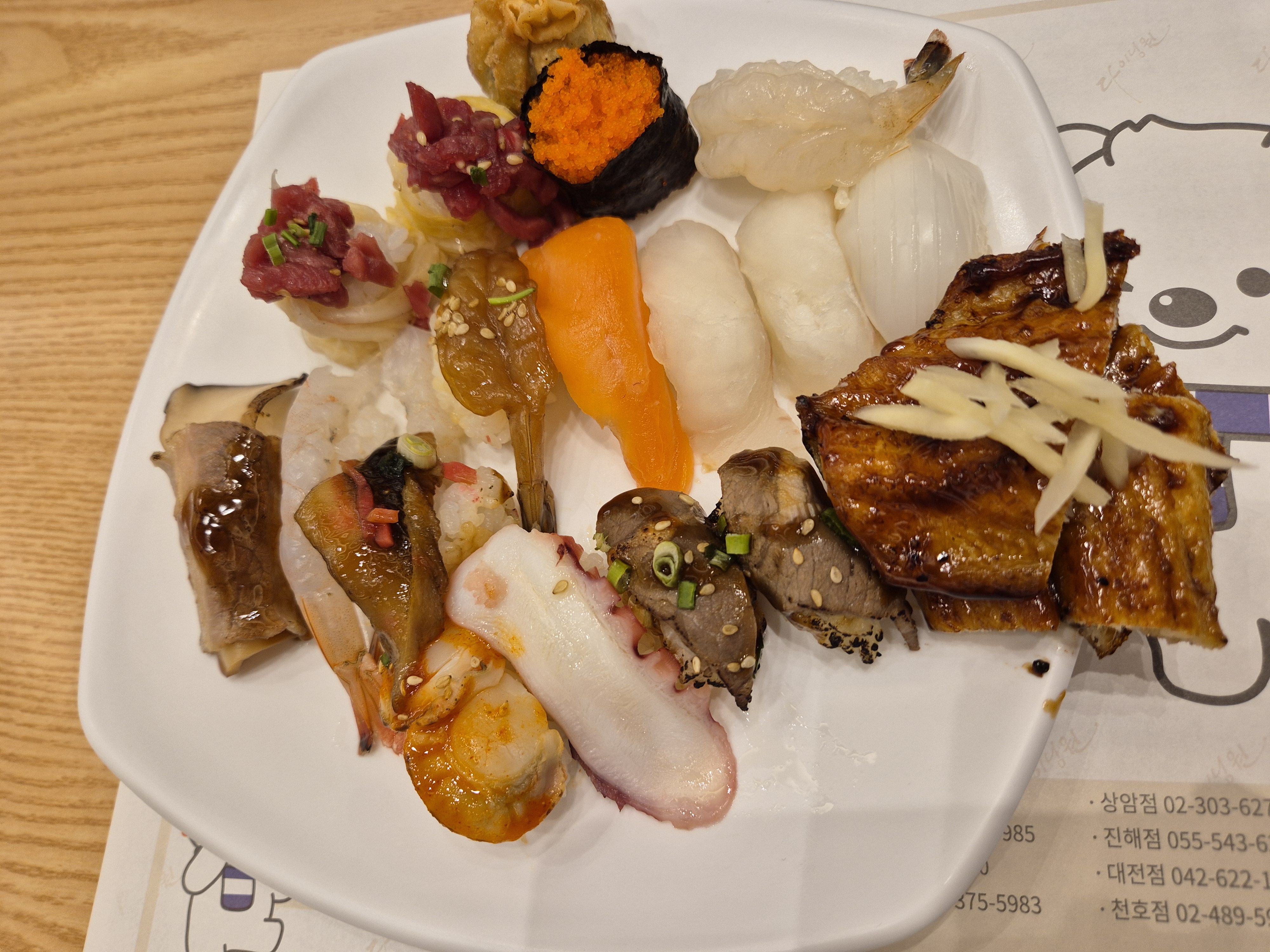 솔직히 1시간 30분까지 밥 먹기 힘들더라고요~~ 한 시간 안에 두 접시 먹으니 끝~~~ 뷔페식이라 먹을 건 참 많은데 저는 초밥을 위주로 먹었어요.