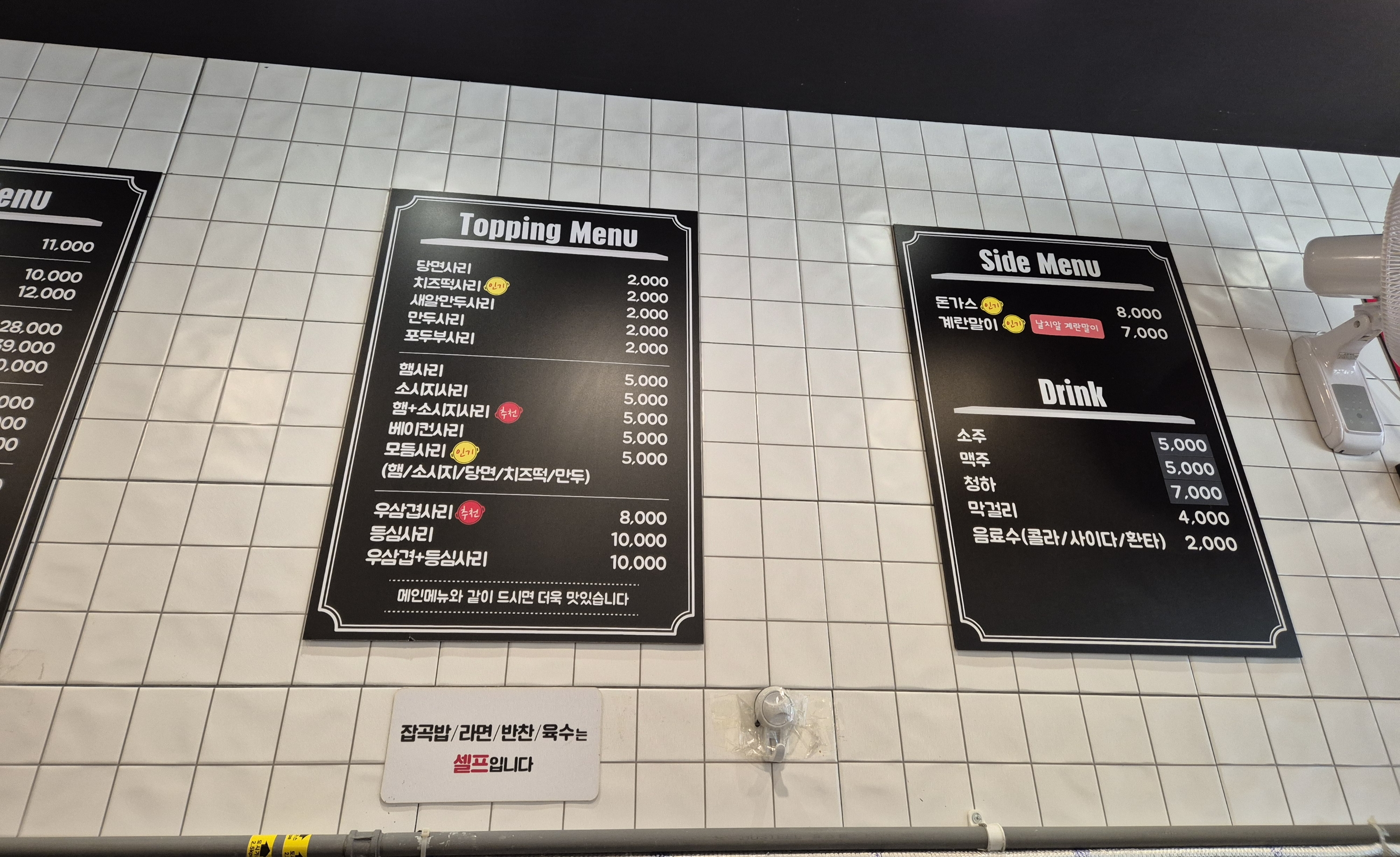 잡곡밥, 라면, 반찬 육수는 셀프입니다.