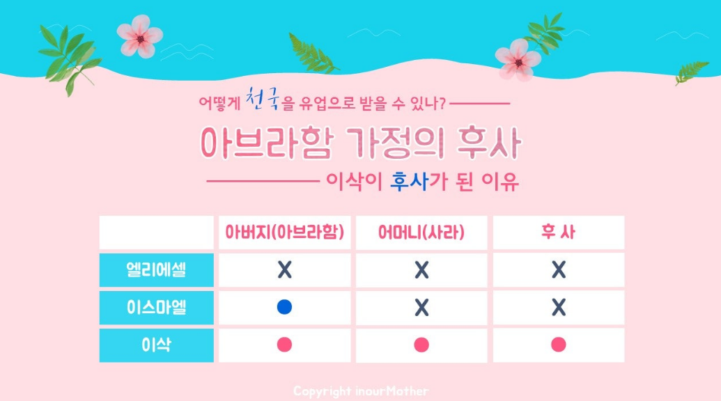 이삭이 후계자로 낙점된 최종요인이 사라인 어머니에 있었던 것처럼 오늘날 우리도 아버지하나님 어머니하나님과 함께 하늘에 돌아가 모든 축복을 이어받는 하늘 후사들이 되었으니 너무나 행복합니다.