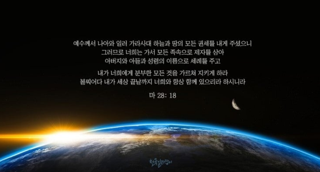 예수께서 나아와 일러 가라사대 하늘과 땅의 모든 권세를 내게 주셨으니 그러므로 너희는 가서 모든 족속으로 제자를 삼아 아버지와 아들과 성령의 이름으로 세례를 주고 내가 너희에게 분부한 모든 것을 가르쳐 지키게 하라 볼찌어다 내가 세상 끝날까지 너희와 항상 함께 있으리라 하시니라