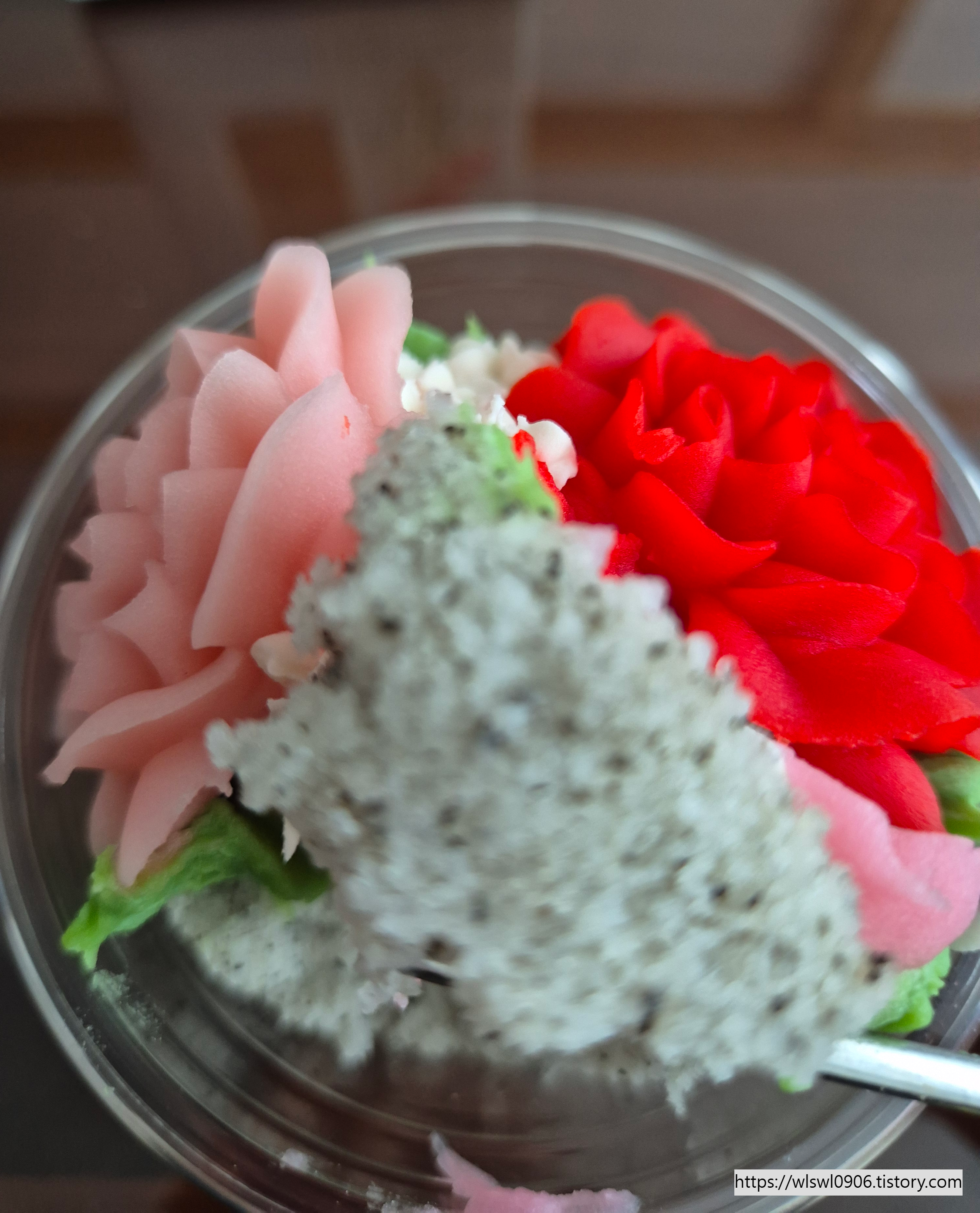 완전 쫀득쫀득 한 식감이 달달한 꽃 베이스랑 너무 잘 어울리는 맛이었어요.
