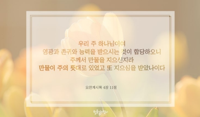 우리 주 하나님이여 영광과 존귀와 능력을 받으시는 것이 합당하오니 주께서 만물을 지으신지라 만물이 주의 뜻대로 있었고 또 지으심을 받았나이다 하더라
