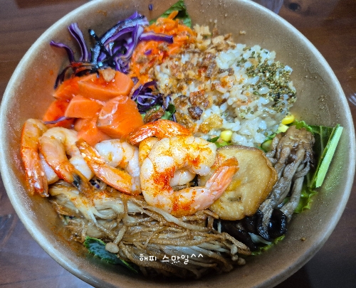 [씨푸드의 최고봉] 쉬림프훈제연어포케는 연어, 새우. 각종 야채샐러드 들어갔고 스리라차 추전 해준 소스에 먹으니 오호! 맛납니다ㅋ 역시 씨푸드 최고봉이라 이름 지을만한데요ㅎㅎ