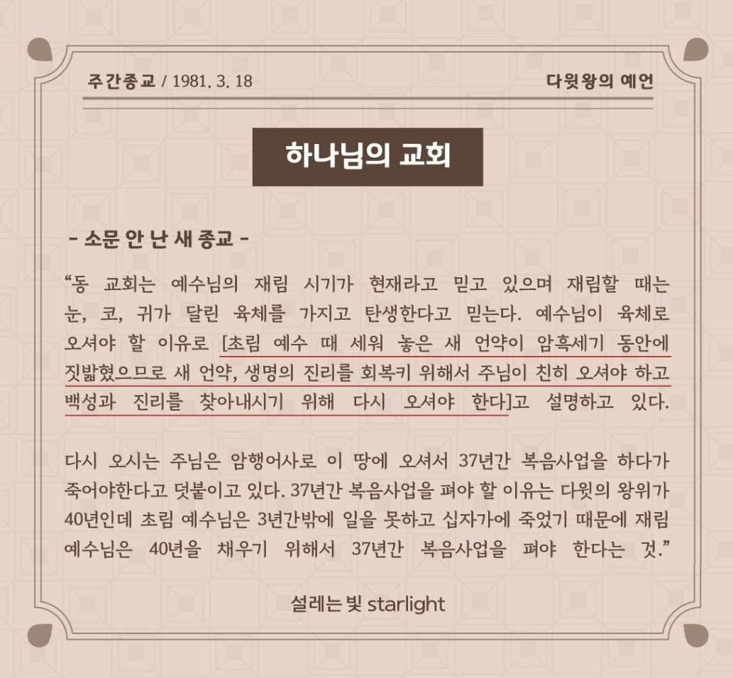 그런데 올리워 가시기 4년 전에 미리 복음 사역을 마치시고 올리워 가실것도 1981년 3월 18일자 주간종교 신문(소문 안 난 새 종교)에 이미 당신께서 다시오시는 재림예수님이심을 미리 알려놓으셨습니다.