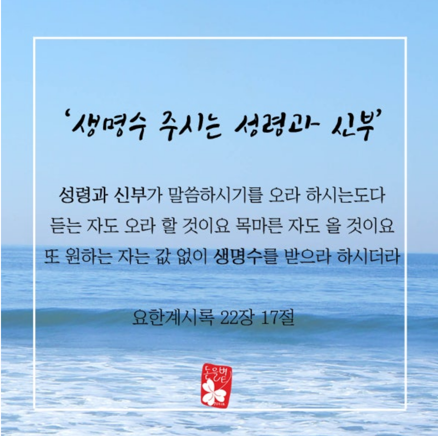 성령과 신부가 말씀하시기를 오라 하시는도다 듣는 자도 오라 할 것이요 목마른 자도 올 것이요 또 원하는 자는 값 없이 생명수를 받으라 하시더라[계 22장 17절]