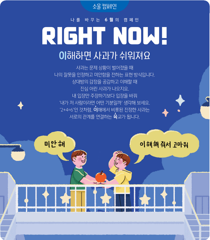 오늘 공유할 포스팅은 하나님의교회 학생부를 위한 소울 사이트에 등록된, 6월의 캠페인 "이해하면 사과가 쉬워져요"입니다.